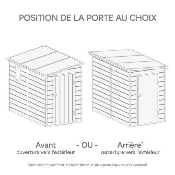 - Türpositionierung: Es ist möglich, die Tür auf die gegenüberliegende Seite zu setzen. Die Innenseite der Tür wird dann zur Außenseite: Sie ist weniger "gewölbt" (oder glatter) als die Außenseite. Das Dachdreieck passt sich problemlos dieser Änderung an. Die Öffnungsrichtung erfolgt dann ebenfalls nach außen.