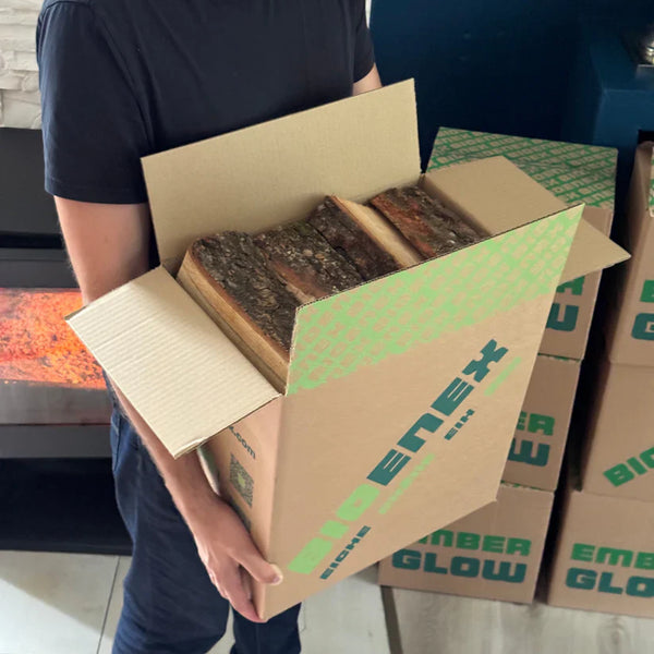 Wie alle BIOENEX-Brennholzprodukte wird auch unser Eichenbrennholz über einen langen Zeitraum in einem industriellen Ofen getrocknet, um extrem niedrige Feuchtigkeitswerte zu gewährleisten. Dadurch brennt es sauberer, effizienter und mit weniger Rauch als herkömmliche Holzscheite. Zudem tötet der Ofentrocknungsprozess alle Schädlinge, Pilze und Schimmelsporen ab, was es zu 100 % sicher macht, es über längere Zeiträume im Innenbereich zu lagern.